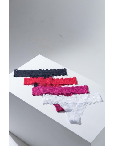 DESCRIÇÃO• Combo de calcinhas• Confeccionadas em renda nas cores conforme imagem • Ajustável na lateral• Traseira fio de rendaCUIDADOSLavagem a mão, não alvejar, não secar em tambor, secagem em varal por gotejamento a sombra, não passar ou utilizar vaporização, não limpar a seco, não limpar a úmido.
